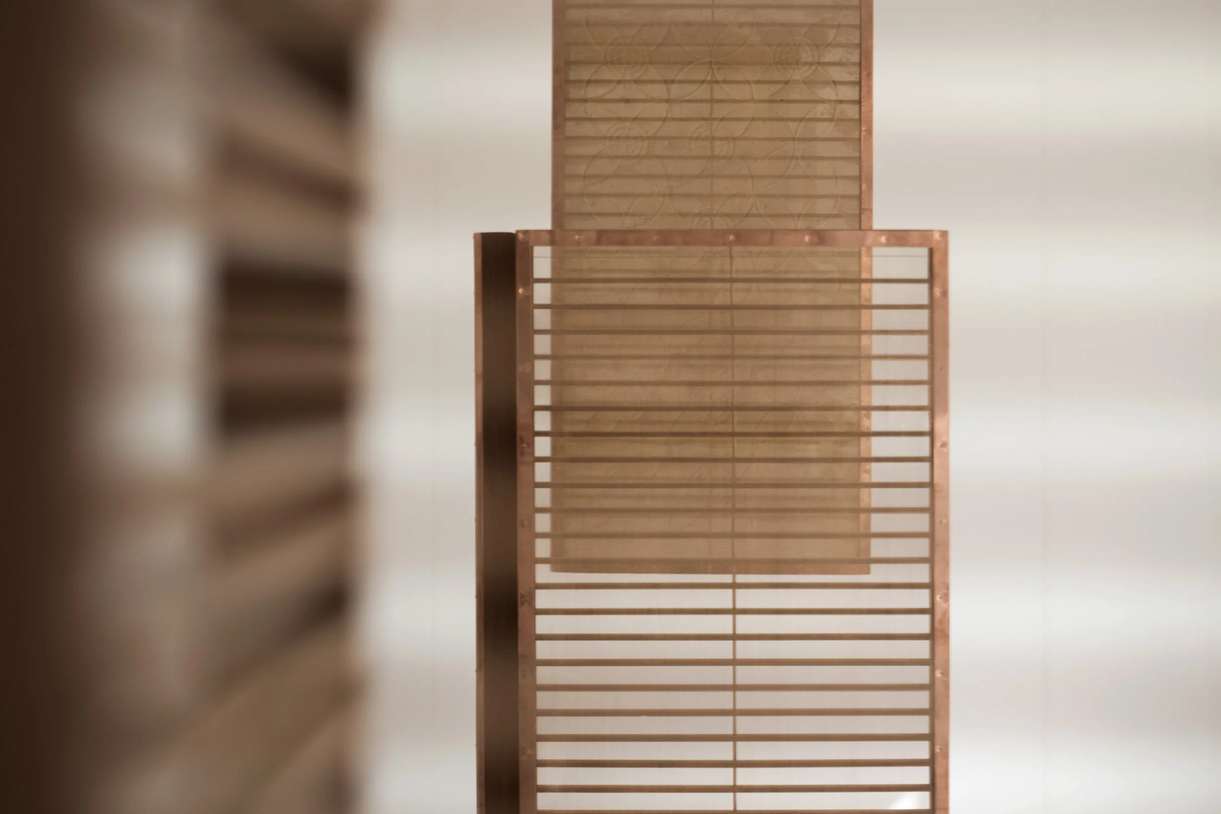 Installation view at til:værks of the ladle frames in process and the watermarked paper. Photo: Laura Stamer